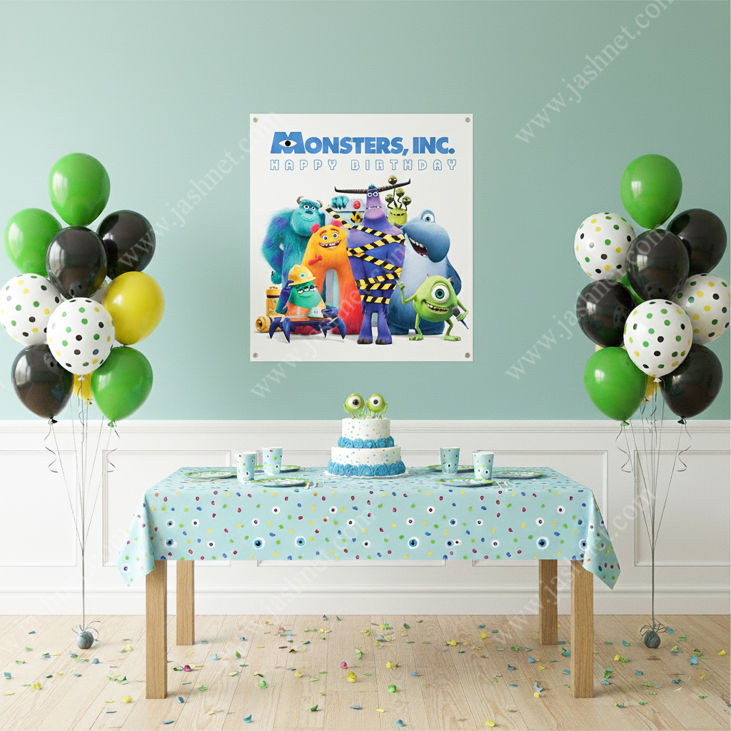 بنر تم کارخانه هیولاها – جنس نانو بنر – اندازه 100*100 سانتی متر – 1 عدد – مناسب برای تزئینات جشن و مراسم تولد – تولید ایران