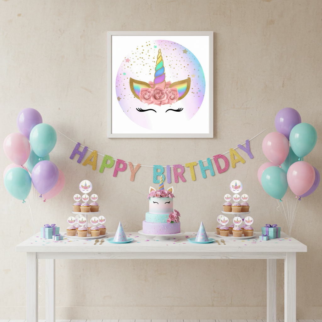 بنر گرد تم تولد اسب تک شاخ ، یکی از محصولات تم اسب تک شاخ می باشد که برای تزئینات دیوار جشن و مراسم استفاده می شود. ابعاد این محصول مربعی شکل 100 در 100 سانتی‌متر است. طرح یونیکورن به صورت دایره‌ای در وسط محصول قرار دارد و اطراف آن با یک کادر سفید رنگ احاطه شده است. جنس بنر تولد از نانو بنر است و قابل شست و شو می باشد.