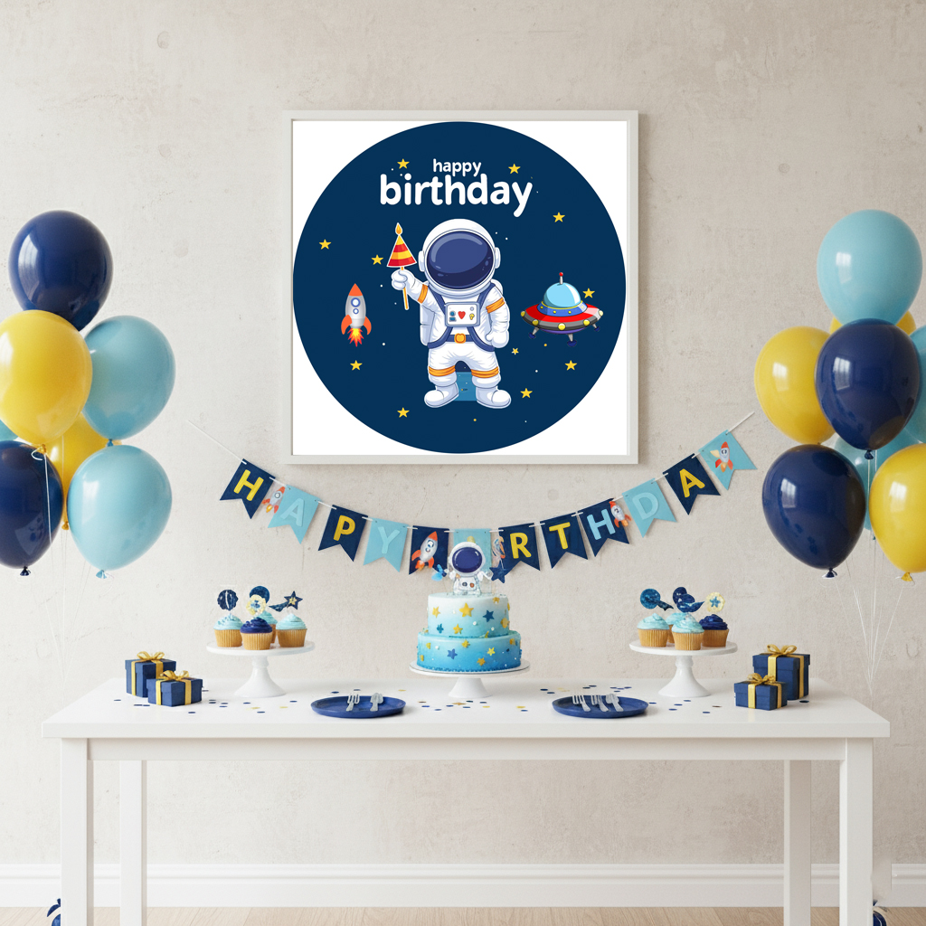 بنر گرد تم تولد فضانورد ، یکی از محصولات تم فضانورد می باشد که برای تزئینات دیوار جشن و مراسم استفاده می شود. ابعاد این محصول مربعی شکل 100 در 100 سانتیمتر است. طرح فضانورد به صورت دایرهای در وسط محصول قرار دارد و اطراف آن با یک کادر سفید رنگ احاطه شده است. جنس بنر تولد از نانو بنر است و قابل شست و شو می باشد.