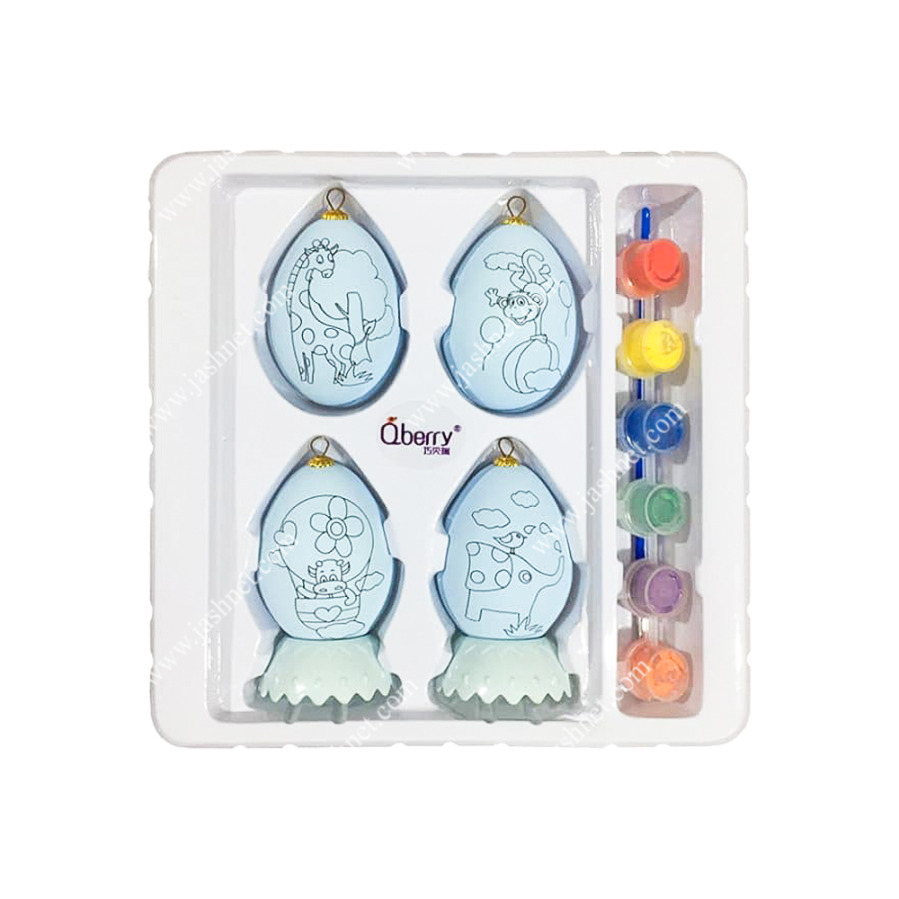 این محصول دارای 4 عدد آویز تخم مرغ به رنگ آبی آسمانی است که هر کدام دارای یک طرح با اشکال حیوانات است و شما می توانید توسط رنگ گواش داخل بسته که شامل 6 رنگ است و توسط قلموی قرار داده شده در بسته بندی طرح های روی تخم مرغ را با سلیقه خود و اطرافیان رنگ کنید.