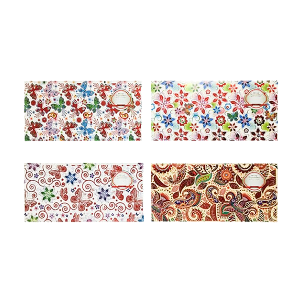 این محصول طرح برجسته دارد ، همچنین رنگ های اکلیلی بکار رفته در آن جلوه خاصی به محصول داده است. 4 عدد محصول در ابعاد 19 سانتی متر طول و 9 سانتی متر عرض هستند که مناسب برای قرار گرفتن پول نقد ، تراول چک و یا سکه در درون آن می باشد.